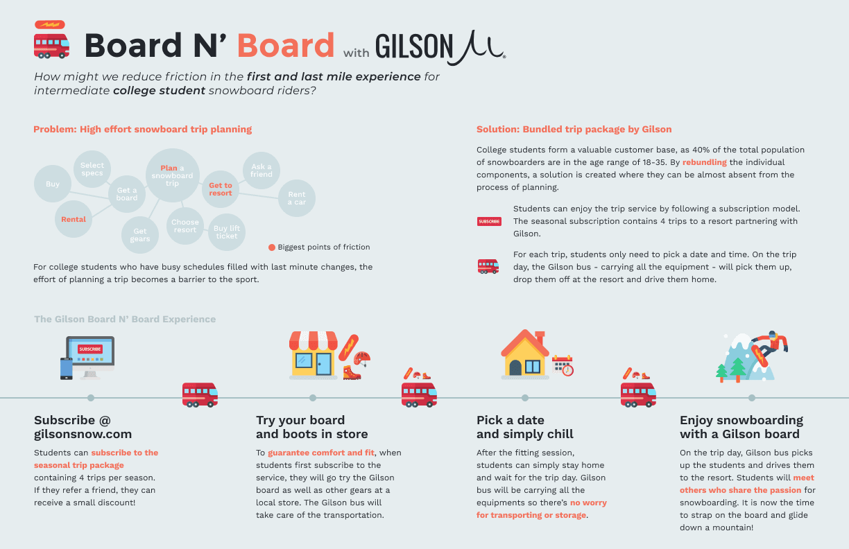 Gilson Snow, a rapidly developing snow sports brand based in the US, approached us to develop a new service that would fit into their current product-service system. This project innovated new ways for them to provide unique experiences for their snowboarding community, which would allow them to compete against other competitors in the field like Burton, LibTech, Nitro, etc.