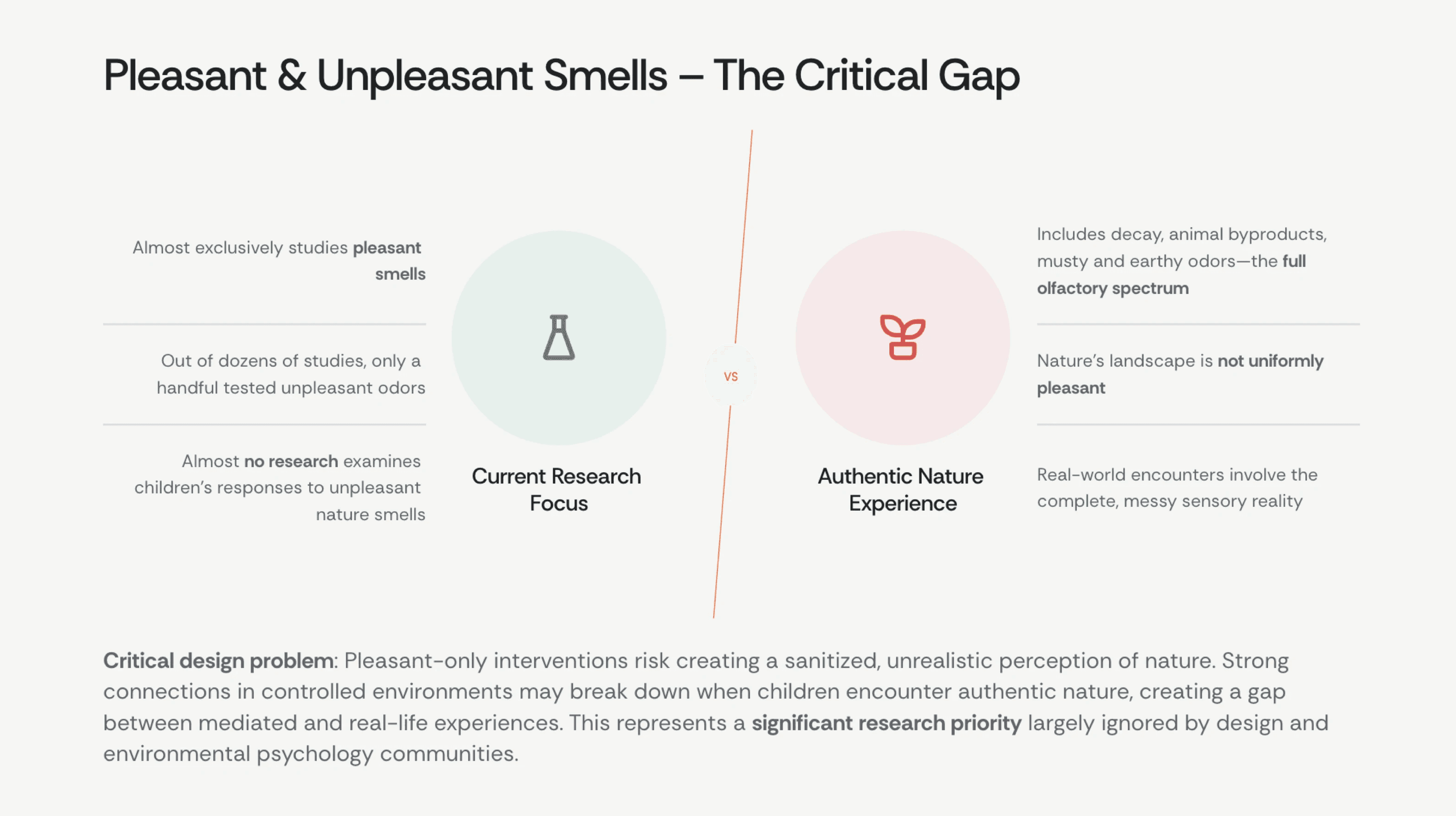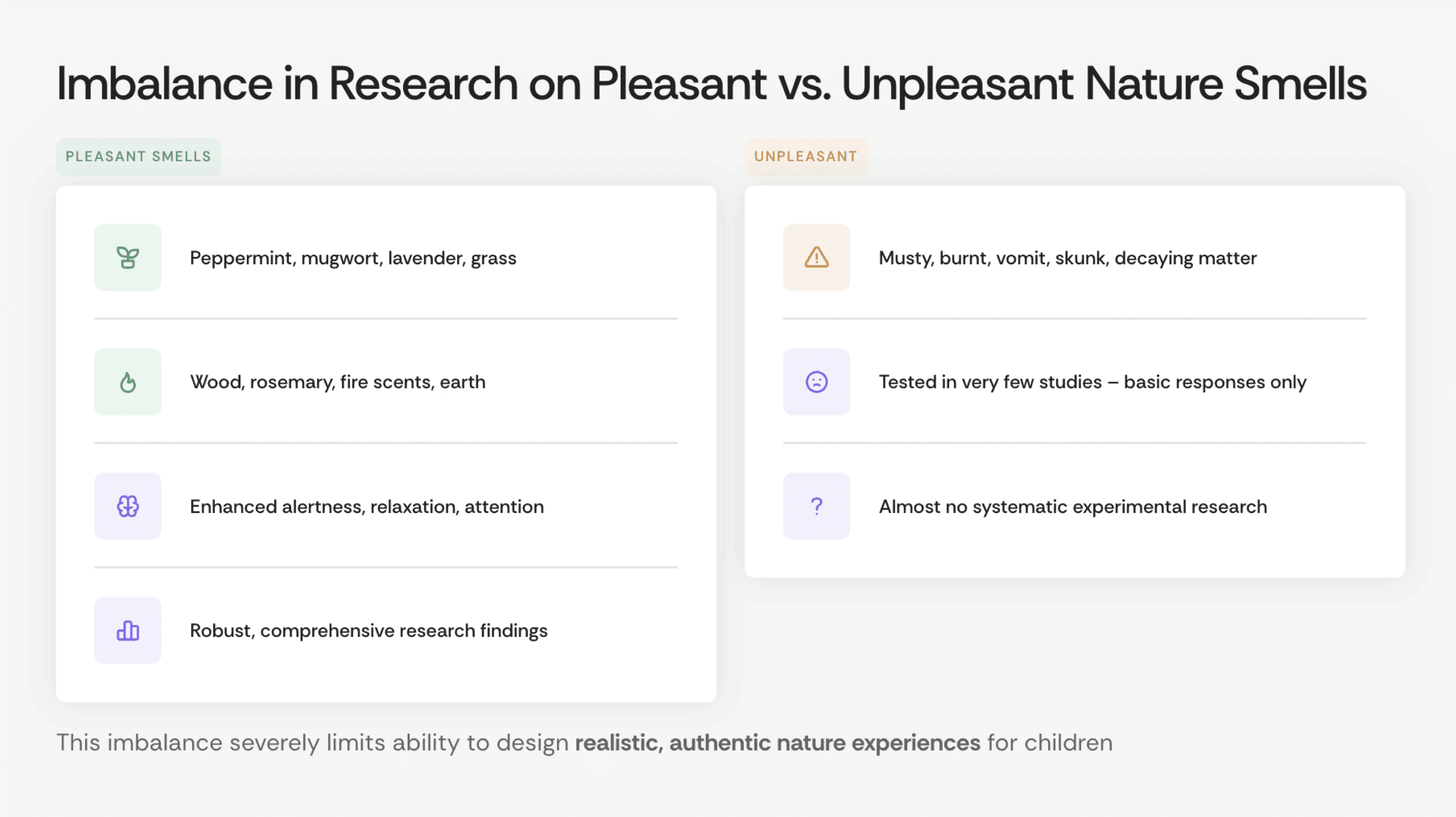 Olfaction is often pushed aside when considering positive interactions between people and nature – even if they are used, only pleasant smells have been studied. This paper aims to deepen the understanding of negatively-perceived smells and their effects, criticizing how "sanitizing" nature's smells risks fostering unrealistic perceptions of nature.